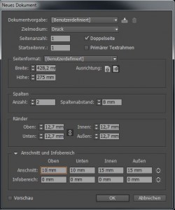 Für InDesign oder QuarkXPress beispielsweise gilt das Bruttoformat als Vorgabe, da diese Programme mit Beschnittrand arbeiten. Zuerst müssen Sie ein „Neues Dokument“ erstellen. Darin ist dann das „Seitenformat > benutzerdefiniert“ einzustellen – dies ergibt sich aus den berechneten Längen und Höhen. Spalten und Stege sind für einen einfachen Titel nicht zu definieren. Im „Anschnitt und Infobereich“ ist der ausgewiesene Anschnitt einzugeben, also in unserem Beispiel zum Hardcover Oben und Unten je 10 mm, Innen und Außen je 15 mm.