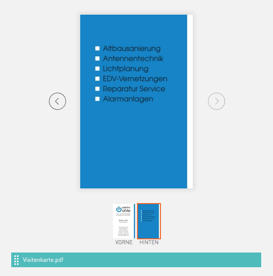 Abschließend haben Sie auf unserer Produktseite im Bereich „Upload & Vorschau“ die Möglichkeit, den Briefbogen und die Visitenkarte jeweils in einer Online-Vorschau zu betrachten. Ist alles okay, können Sie über den Warenkorb bestellen.