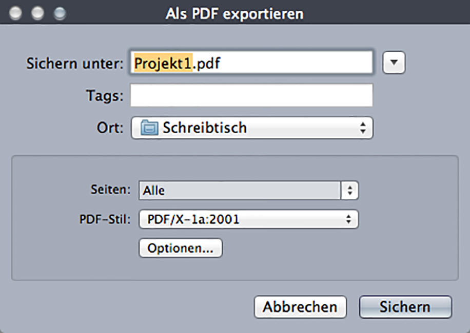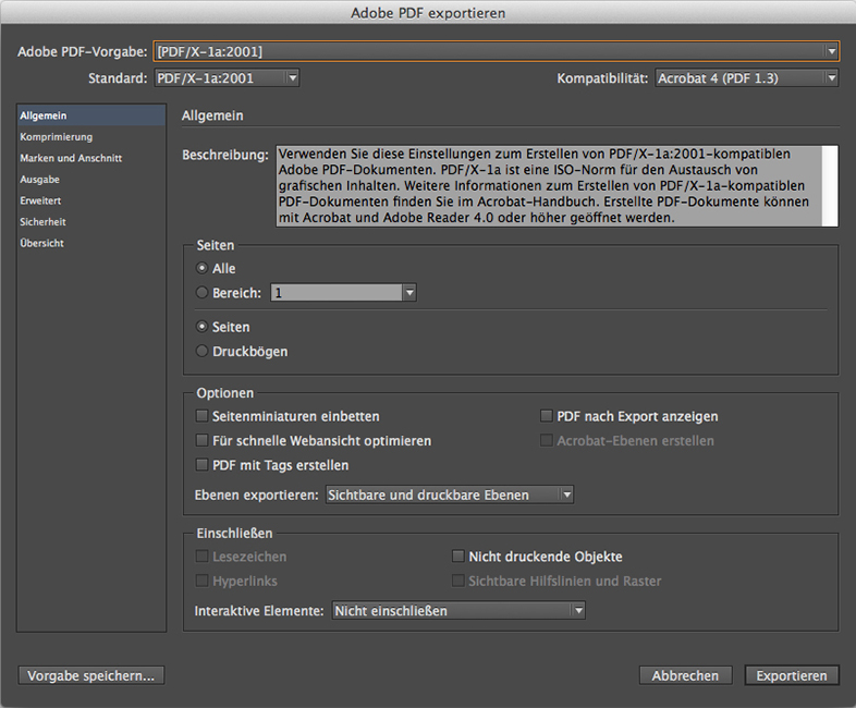 Wählen Sie als „Adobe PDF-Vorgabe“ die Bezeichnung „PDF/X-1a“ und aktivieren Sie unter „Seiten“ den Bereich „Alle“. Unter „Optionen“ und „Einschließen“ sind keine Einstellungen erforderlich.