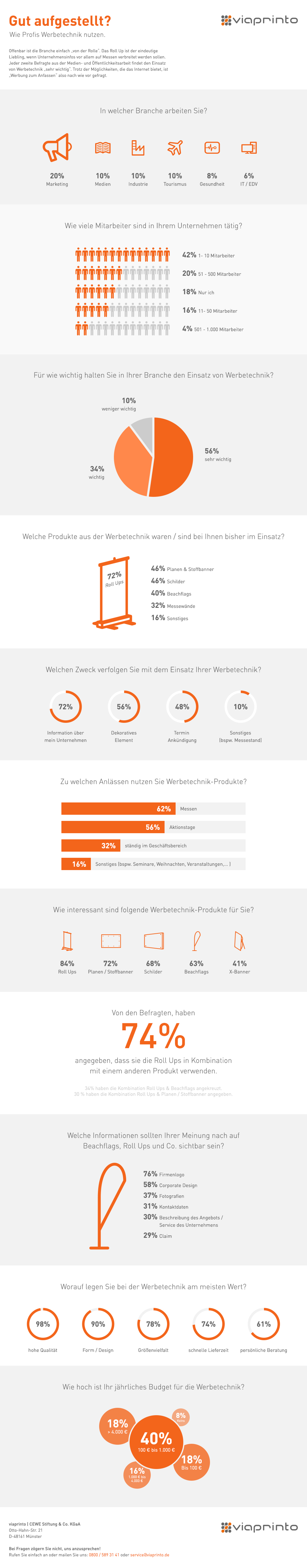 Fast alle Befragten legen beim Kauf von Werbetechnik großen Wert auf gute Qualität, ansprechendes Design und handlichen Auf- und Abbau der Produkte. Diese Bewertung decke sich, so Morjan, mit den Ansprüchen an die Produktauswahl bei viaprinto. „Wir haben den Kunden und seine Zufriedenheit im Blick und versuchen flexibel und schnell auf seine Anforderungen einzugehen. Deswegen lag die Entscheidung, unser Print-Portfolio um Werbetechnik in diesem Jahr zu erweitern, auf der Hand.“