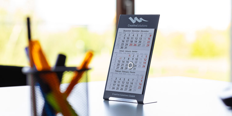 Der Tischkalender Metall kommt in zwei Varianten: entweder aus gebürstetem Edelstahl oder aus pulverbeschichtetem Feinblech mit einer Stärke von 0,5 mm. Eine besonders farbenfrohe Auswahl hat der Kunde bei der Pulverbeschichtung – sie ist in sieben unterschiedlichen Farben erhältlich: anthrazit, grün, blau, orange, rot, schwarz oder weiß. Bedruckt werden kann der rund 25 mm hohe und 95 mm breite Kopf sowie eine zusätzliche Gestaltungsfläche am Fuß (8 x 95 mm). Dazwischen ist Platz für ein Kalendarium, dessen letzte Seite magnetisch ist und somit von selbst am Metall haften bleibt. Zur optimalen Positionierung des Kalendariums ist ein hauchdünner Strich in Kopfnähe aufgedruckt.